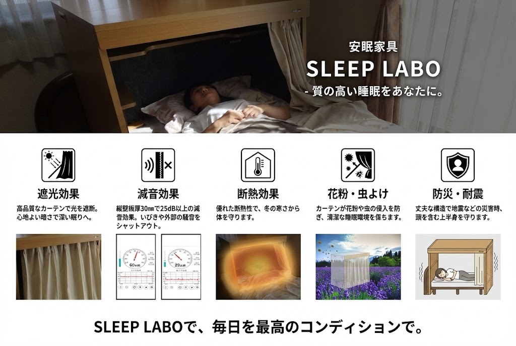安眠を望むすべての方に 1,遮光のカーテンで深い眠りへ 2,30mmの壁で25dB以上の遮音効果。自分のいびきでパートナーの安眠を妨げている方が使えば、音を漏らさない。パートナーのいびきで安眠が妨げられている方が使えば、音を入れない。 3,冬の寒さから守りつつ、適度な湿度を保ちます。 4,寝ている耳元の蚊で起きることも無くし、花粉の季節にも流入を防ぎます。 5,地震などの災害で、落下物から大切な頭と上半身を守ります。 お求めのショップへは緑ボタンをクリック