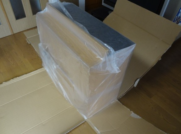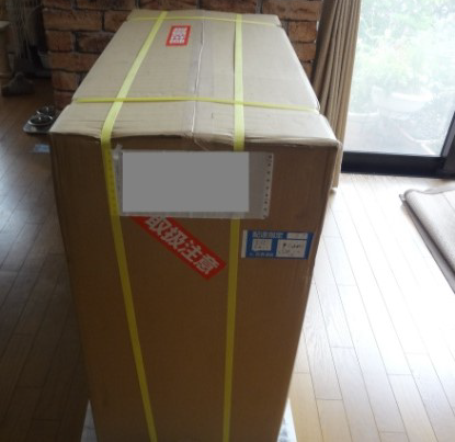 外箱の四隅を縦に切り、ビニールを取り外します 。移動後に設置する場合は、ビニールを残したまま運ぶことを推奨します 。